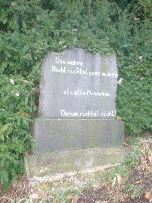 Maucher ergänzte die Christus-Statue am "Heiligen Grab" später durch zwei Inschriftsteine, die rechts und links von der Statue zu sehen sind. "Das wahre Recht richtet ganz anders als alle Menschen. Darum richtet nicht!" und "Denn aller Menschen Urteil ist irrig oder böse." Auch hierzu findet sich eine erläuternde Tafel: "Diese zwei Gedenksteine wurden zu Weihnachten 1956 errichtet und der Mahnspruch: Gott richtet ganz anders als alle Menschen usw. vom derzeitigen Besitzer Wilhelm Maucher in diese Steine einmeißeln lassen. Diese Worte sollen die Menschen, welche über ihre Mitmenschen so gerne richten und urteilen, zur Besinnung bringen, dass dadurch schon soviel Leid, Unrecht und Streit über die Menschheit gekommen ist…"
